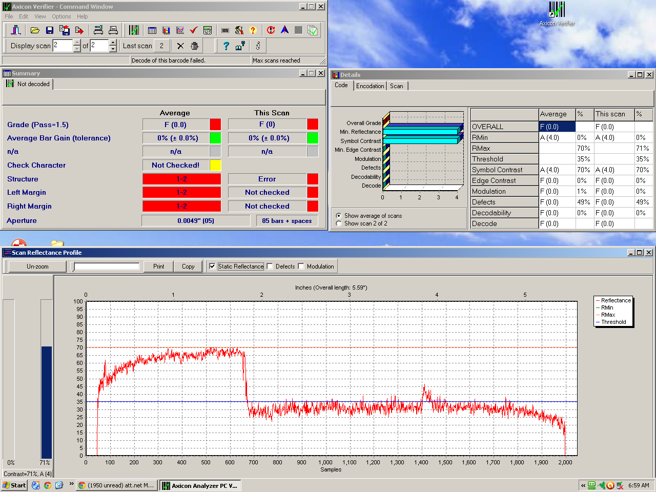 Notice in the Scan Reflectance Profile panel at the bottom of the Axicon Verifier report, that the Static Reflectance option is enabled (checked). This sets the verifier to operate as a reflectance densitometer without testing an actual barcode.